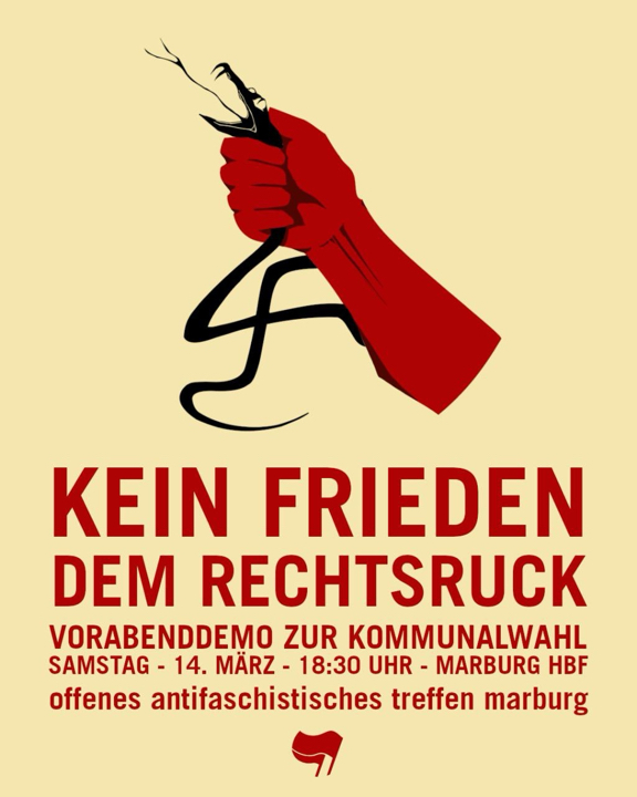 Unter dem Motto „Kein Frieden dem Rechtsruck“ rief das offene antifaschistische Treffen Marburg im Vorfeld der hessischen Kommunalwahl am 14. März zu einer Demo auf. Für uns war sofort klar, da machen wir mit! Leider kam ein anderer Termin dazwischen, aber wir konnten immerhin mit 6 Leuten dabei sein.